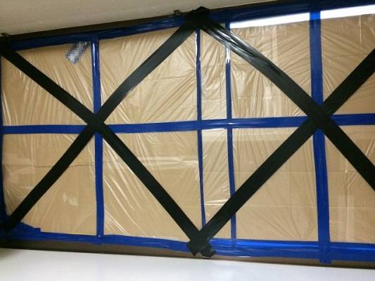 窓の内側にはテープを貼って万が一飛来物が当たり割れても飛散しないよう保険をかけておきます。