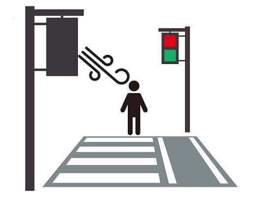 風速10m(メートル)のなか傷んだ古い看板の下を歩くのは危険です。