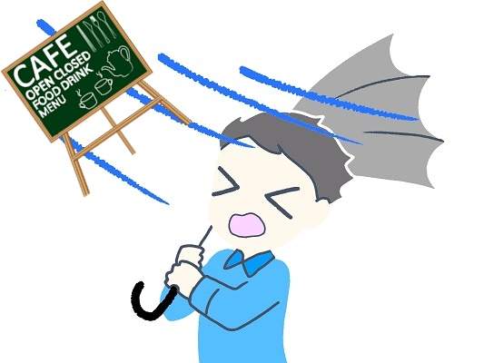 予想される被害の目安は、突風が吹いて傘が飛びそうになったり骨組みが折れるくらいです。