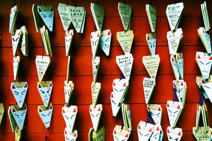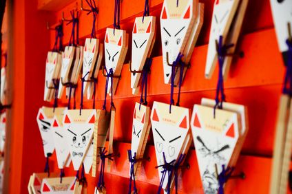 絵馬なので、願い事を書くのが目的です。参拝者の多くは顔を描き加えて個性的な狐を完成させています。