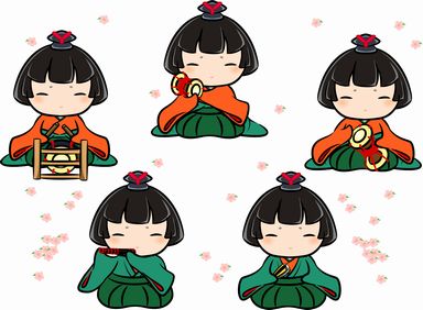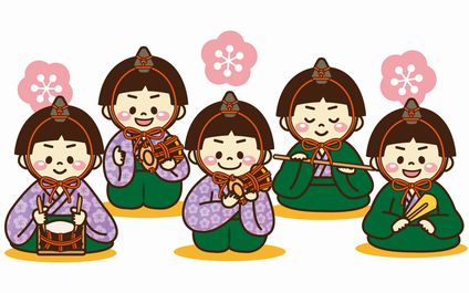 五人囃子はお内裏様(おだいりさま)とお雛様(おひなさま)の結婚式の時に楽器を使って音楽を奏でます。