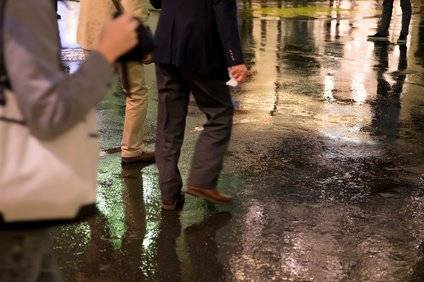 かなり強い雨なので、傘をさしていても足元が濡れるでしょう。