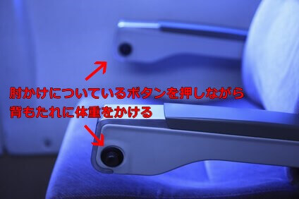 新幹線の座席の倒し方は、肘かけのボタンを押しつつ背もたれに体重をかけるやり方です。